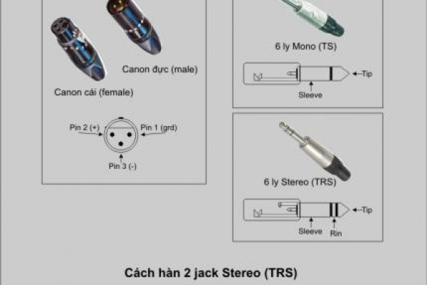 Jack tín hiệu 6 ly Stereo (TRS): Đầu jack Stereo sẽ có 3 cực: thân vỏ ( Sleeve) hàn mạch “ground”, Ring là mạch dây tín hiệu có cực tính âm , Tip là mạch ngoài cùng hàn mạch tín hiệu cực tính dương, gọi tắt là TRS từ các chữ: Tip, Ring, Sleeve thường dùng cho các mạch stereo, balance hoặc các dây tín hiệu insert.